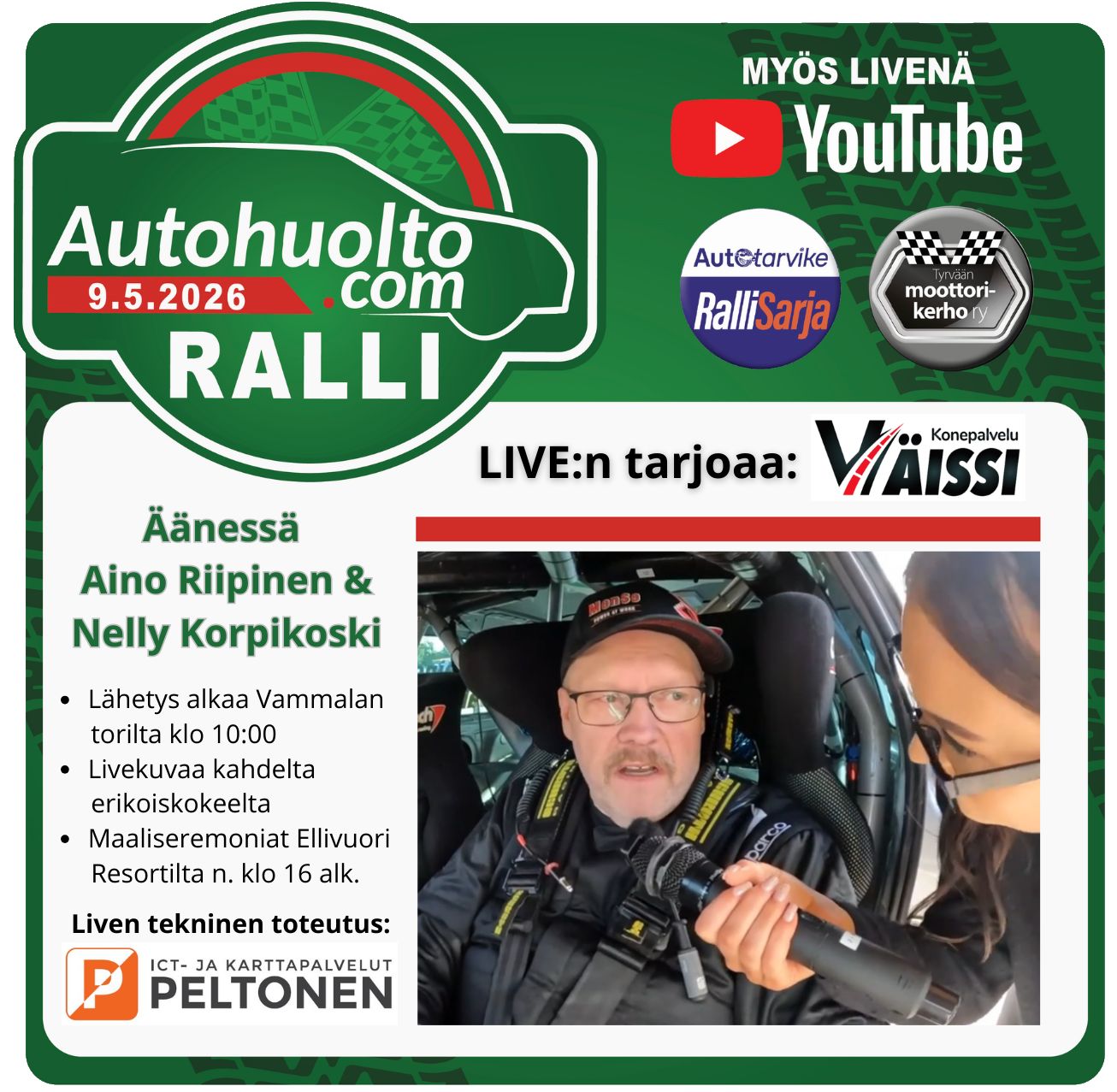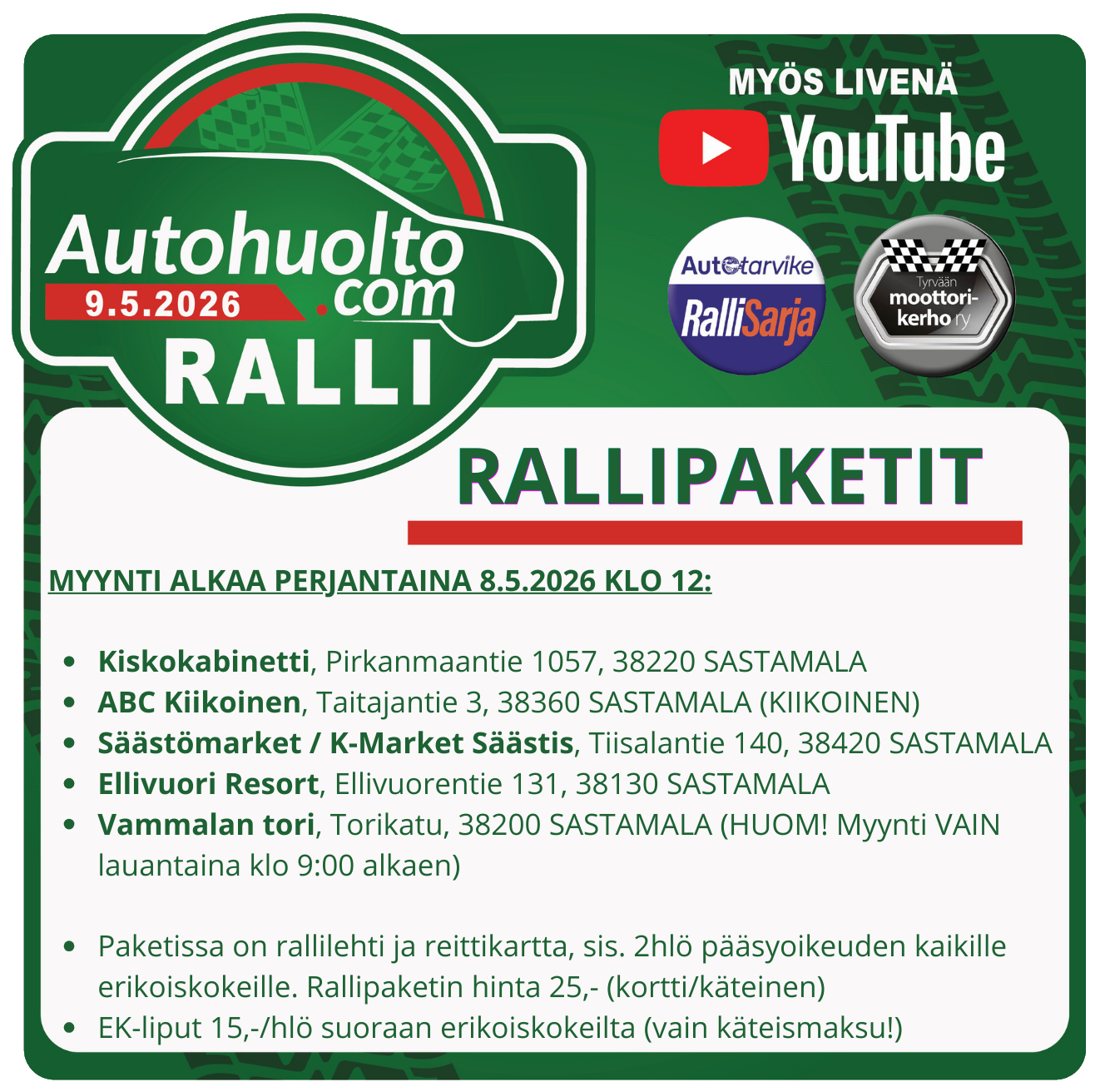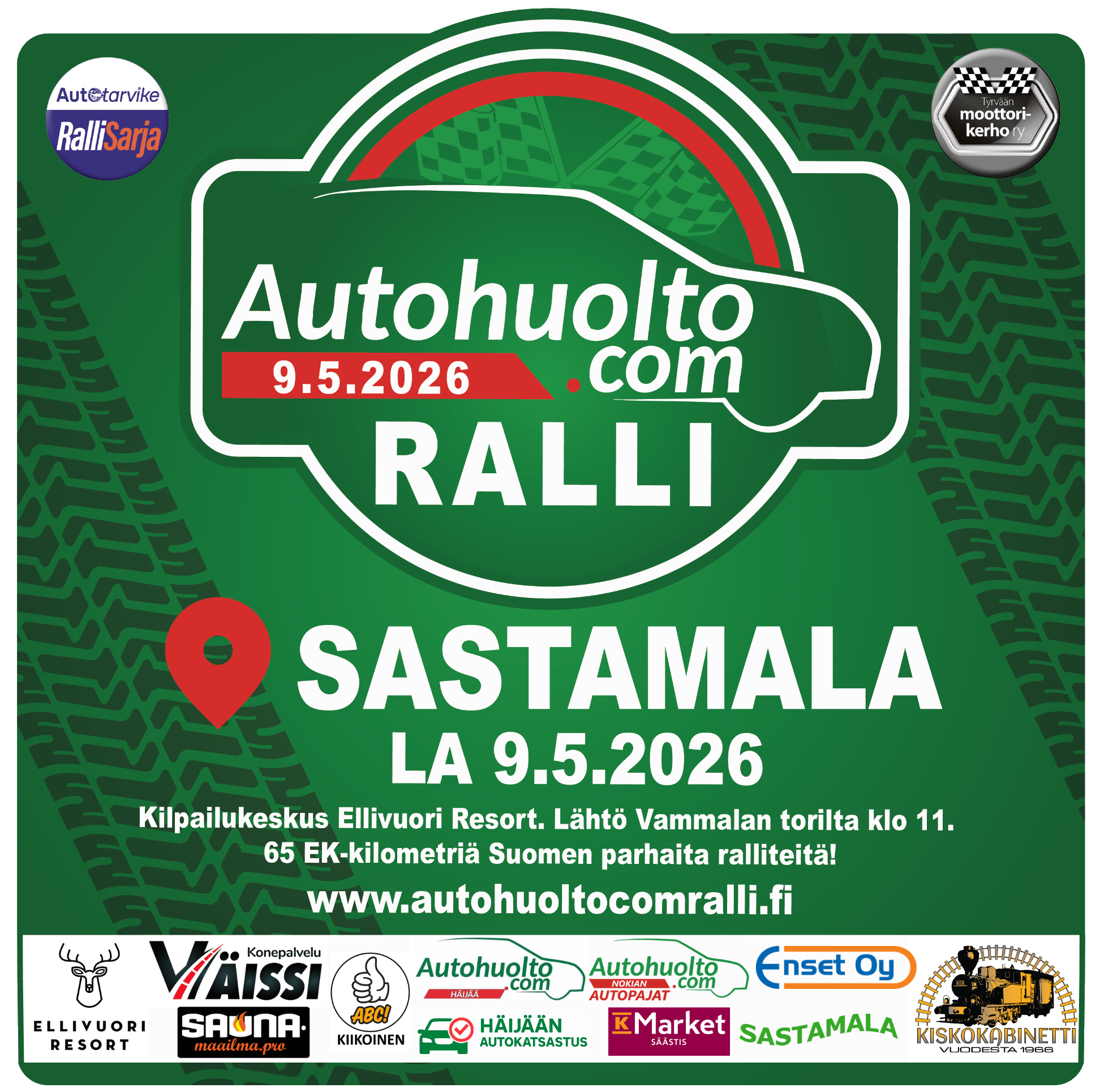 9.5.2026 AUTOHUOLTO.COM RALLI, SASTAMALA / Osakilpailut / Kirjoittaja ratx-@_25P Kilpailukutsu ja ilmoittautuminen Ajaksin sivuilla!Lisätietoja kilpailusta: www.autohuoltocomralli.fiKilpailun järjestää Tyrvään moottorikerho ry.