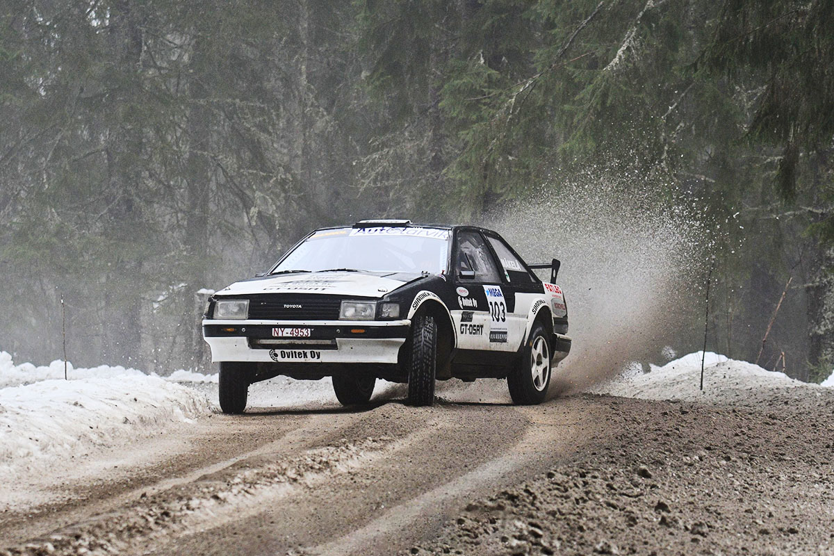 – Tuo meidän kilpuri on vähän vikuri, kun ei kulje suoraan. Syy siihen on toki ollut tiedossa, mutta ei osattu vielä korjata. Hietalan Harri sai jo etupään kuntoon. Heikkilän Juhan kanssa sitä takapään varsia ruuvattiin pari päivää. Nyt pystyi suoralla tiellä ajamaan kaasupohjassa. Toki, kun se siitä spoorista nousee, niin kyllä lähtö on lähellä joka kerta. Keuruulla oli tämän talven ensimmäinen ralli, missä ei ongelmaa ollut. Urria oli hieno, Jukojärvellä yritettiin vähä liikaa ja oltiin useamman kerran katkolla ja se olikin huonoimmassa kunnossa. Ehkä tuo auto on parempi kesällä kurvailla, sanaili Hirvijärvi.