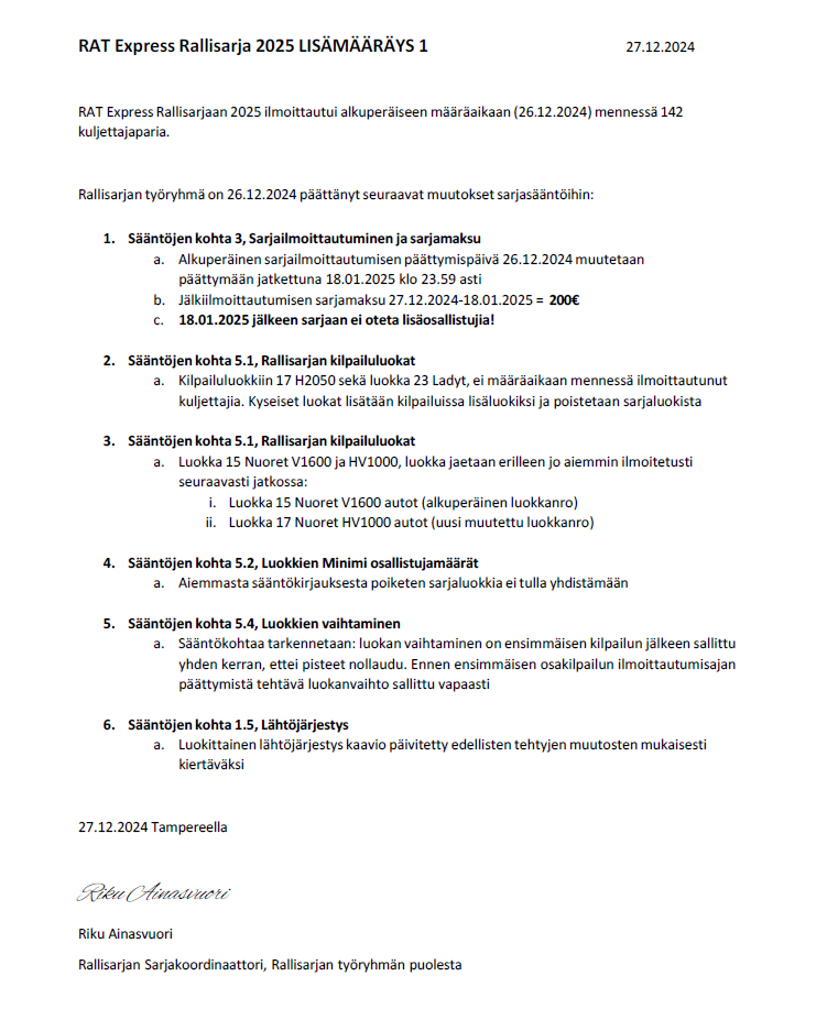 LISÄMÄÄRÄYS 1: JÄLKI-ILMOITTAUTUMINEN 18.1.2025 ASTI YM. SÄÄNTÖMUUTOKSET / Uutiset, Yleinen / Kirjoittaja info@tyrvaanmoottorikerho.fi HUOM! OHJEET JÄLKI-ILMOITTAUTUMISEEN LÖYTYY SÄÄNTÖJEN KOHDASTA 3!