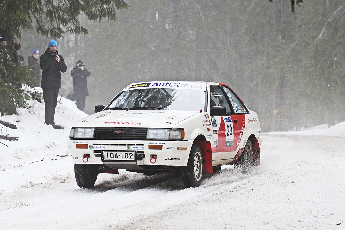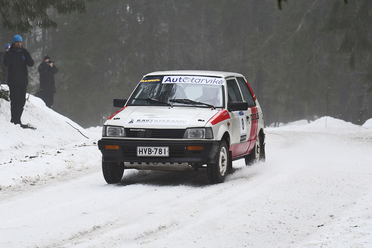 – Toivakkarallin jälkeen päätin etsiä tasavertaisen auton pikkuluokkaan, koska alitehoisella 1-ryhmän Fiatilla ei vaan ehdi. Hommasin viikkoa ennen kisaa Charaden, jota pääsin testaamaan Saukkolan EK:lla tunnin verran. Tallipäällikkökin (vaimo) ihmetteli, miksi tallissa onkin neljä autoa. Ykköspätkä meni totuttelusta huolimatta hyvin, mutta kakkosella urassa ei onnistuttu. Auto sammui tauon jälkeiselle siirtymälle, mutta onnistuttiin saamaan sähköt lisävalojen johtoja käyttäen. Pikku pelko oli, päästäänkö maaliin ollenkaan, selvitti Könönen.